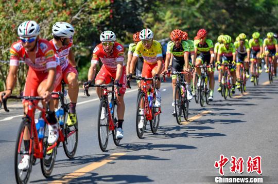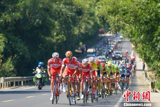 图为身着“黄衫”的意大利安德罗尼车队的福斯托·马斯纳达(左4)大团中骑行。 骆云飞 摄