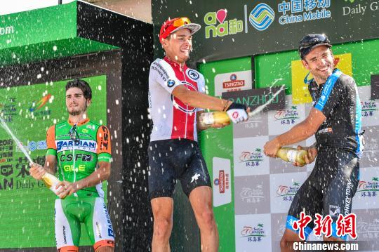 图为获得赛段前三的选手喷洒香槟庆祝。 骆云飞 摄