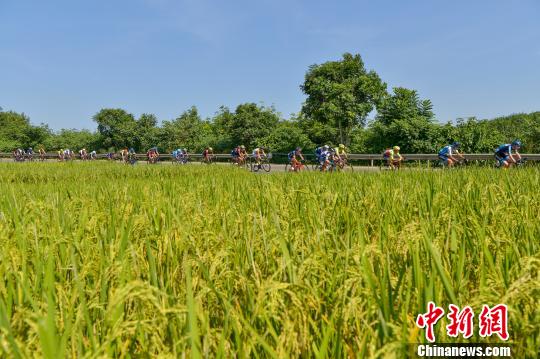 图为环岛赛车手们在一片稻田前骑行。 骆云飞 摄