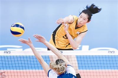 12月9日,土耳其瓦基弗银行队球员朱婷(上)在比赛中扣球。
