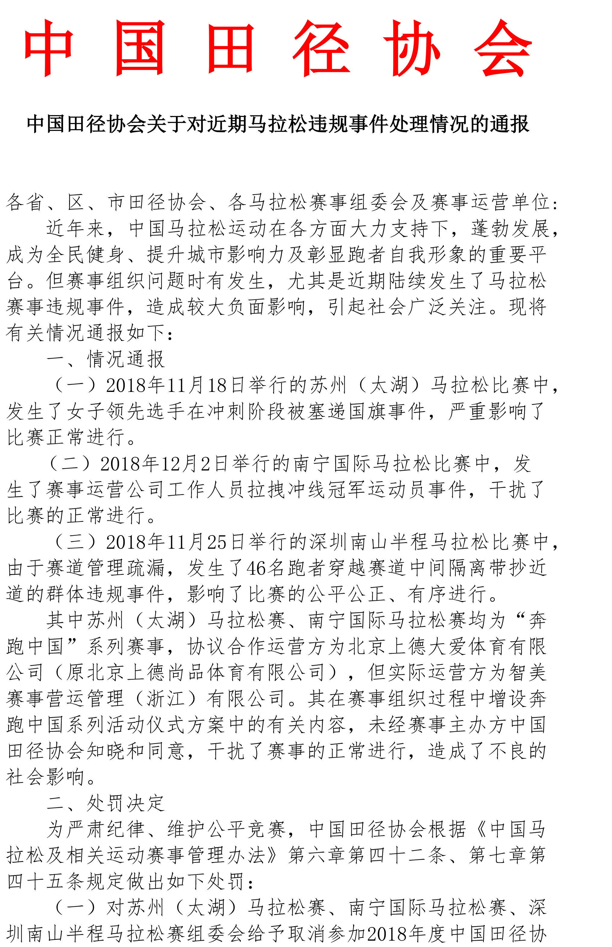 通报中提到为严肃纪律、维护公平竞赛,中国田径协会根据中国马拉松相关管理规定,决定对2018年苏州(太湖)马拉松“递送国旗”事件,南宁国际马拉松“拉拽冲线冠军运动员”事件,深圳南山半程马拉松比赛“抄近道”事件中涉及的各赛事组委会作出取消参加2018年度中国田径协会马拉松赛事等级评定资格的处罚,并要求上述组委会限期向中国田径协会递交书面整改报告;对事件中涉及的运营公司——北京上德大爱体育有限公司(原北京上德尚品体育有限公司)、智美赛事营运管理(浙江)有限公司给予警告处罚,并要求上述公司限期向中国田径协会递交书面整改报告。中国田径协会将视上述组委会及公司整改情况决定是否追加处罚。
