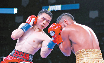 当地时间1月26日,中国选手徐灿(左)和罗哈斯在比赛中。当日,徐灿在美国休斯敦战胜世界拳击协会(WBA)羽量级拳王、波多黎各选手罗哈斯,夺得拳王金腰带。