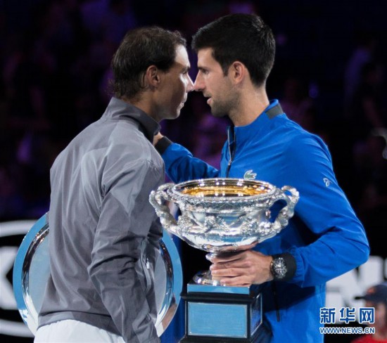 1月27日,焦科维奇(右)与纳达尔在颁奖仪式上。 当日,在2019年澳大利亚网球公开赛男子单打决赛中,塞尔维亚选手焦科维奇以3比0战胜西班牙选手纳达尔,夺得冠军。 新华社发 (胡泾辰摄)