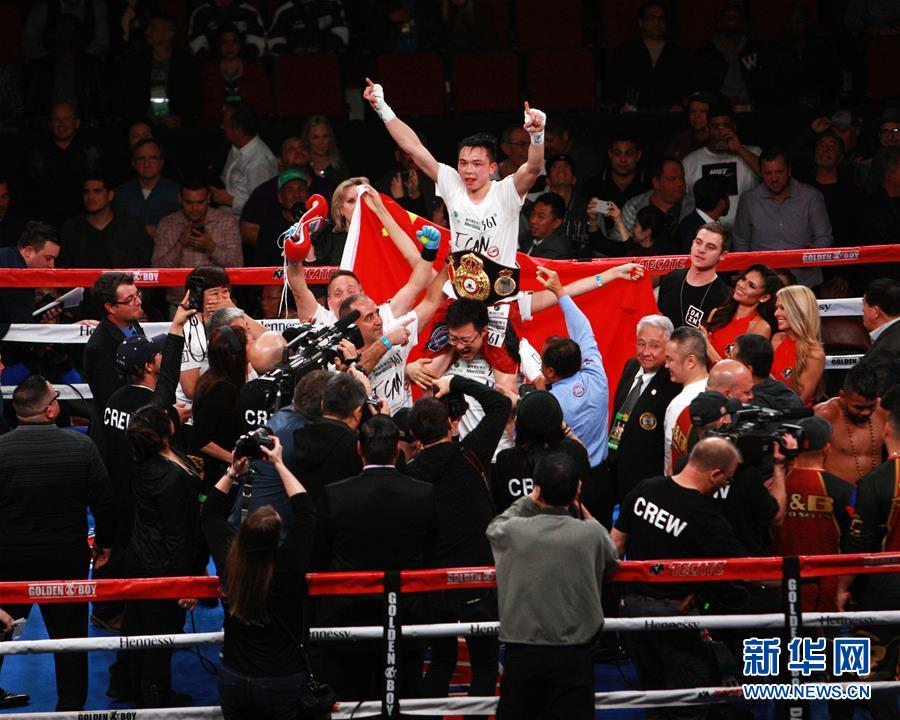 1月26日,徐灿(上)庆祝胜利。 当日,中国选手徐灿在美国休斯敦战胜世界拳击协会(WBA)羽量级拳王、波多黎各选手罗哈斯,夺得拳王金腰带。 新华社发 (钟佳摄)