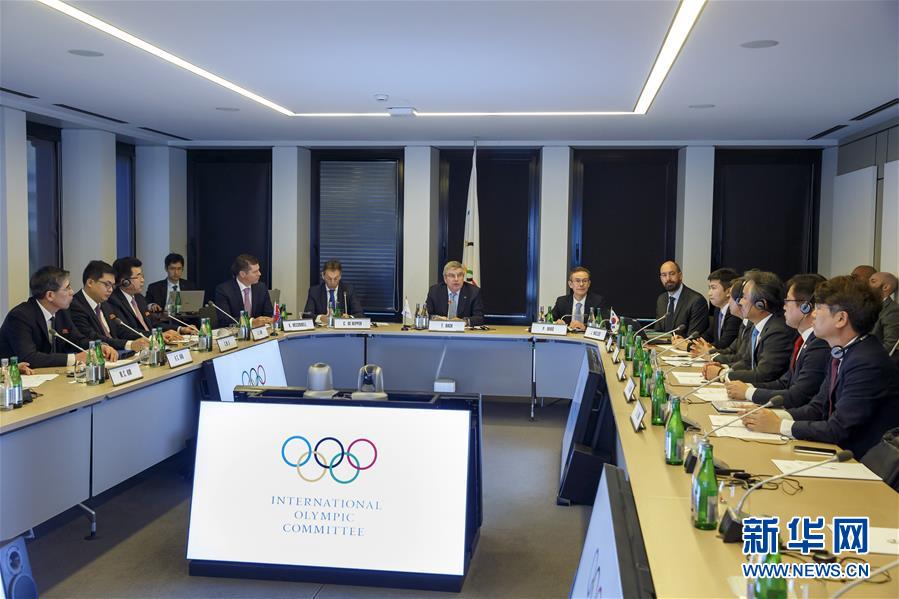 2月15日,国际奥委会主席巴赫(中)在会议上发言。 新华社发(萨尔瓦托雷·迪·诺尔菲摄)