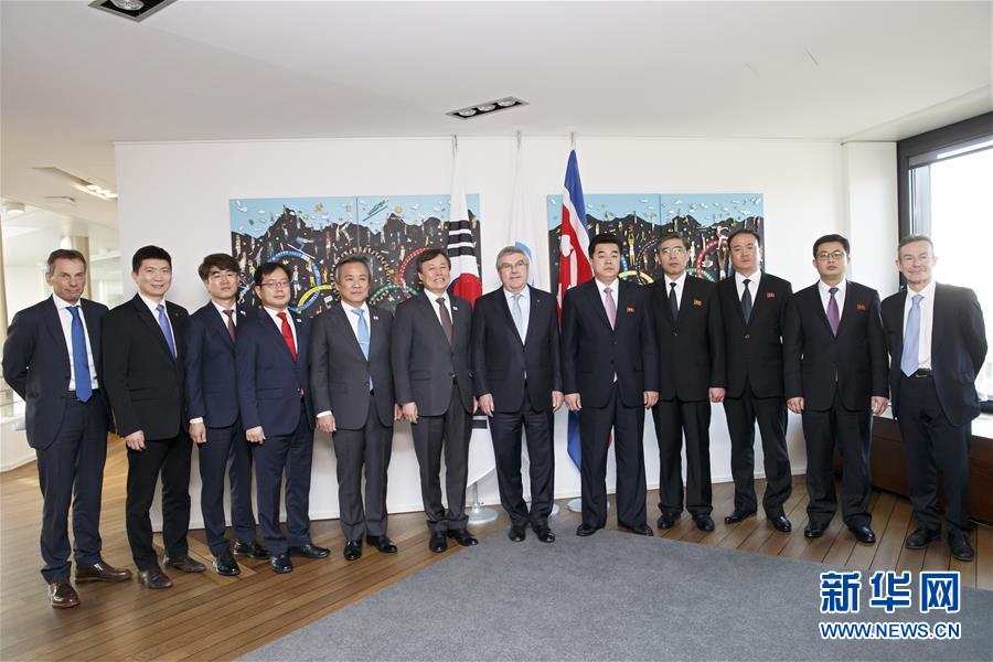 2月15日,国际奥委会主席巴赫(右六)与韩国文化体育观光部长官都钟焕(左六)和朝鲜奥委会主席、体育相金日国(右五)在会前合影。 新华社发(萨尔瓦托雷·迪·诺尔菲摄)