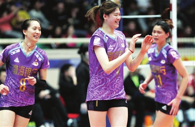 本报讯(记者 梁斌 摄影 崔跃勇)昨晚,2018—2019赛季女排超级联赛半决赛第四场比赛,卫冕冠军天津女排在连丢两局、第三局2:9落后的不利局面下连扳三局,主场以3:2逆转江苏女排,总比分3:1淘汰对手,闯进决赛,五局比分为22:25、21:25、25:20、25:11和15:6。第三局关键时刻登场,新援杜清清表现极为出色,一传保障、发球、进攻、拦网和防守全面发挥,在她的带动下,天津女排在“福地”──市人民体育馆上演“无逆转、不天津”的经典好戏,这位谦虚、爱笑、淳朴的山东姑娘获得本场比赛的MVP。天津队“头号火力点”李盈莹拿下全场最高的36分。