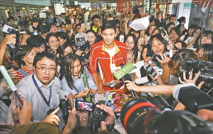 2016年8月16日,参加里约奥运会的宁泽涛(中)抵达首都机场时被媒体和粉丝包围。