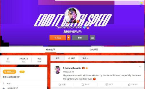 C罗在微博为凉山受灾群众和牺牲消防员祈祷。图片来源:微博截图