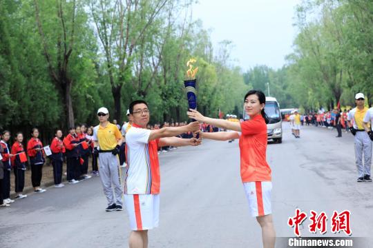 火炬手正在传递火炬。 李红卫 摄