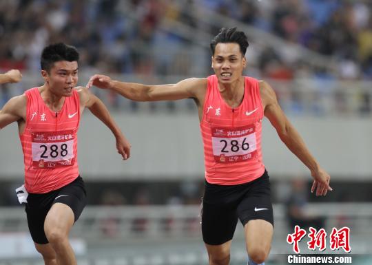 男子百米飞人大赛中的运动员们。 于海洋 摄
