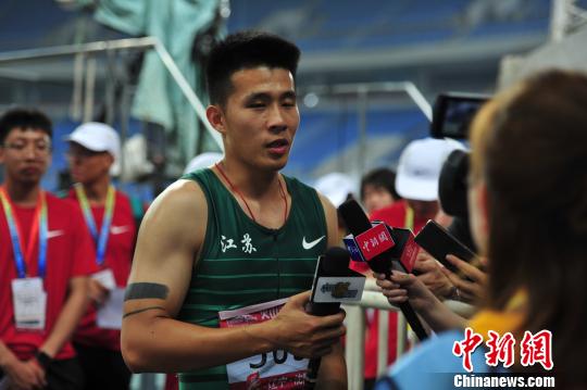 杨洋获得男子百米飞人大赛冠军后接受采访。 于海洋 摄