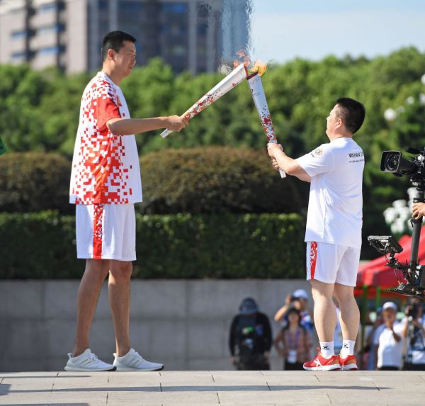 8月1日,火炬手王治郅(左)与火炬手肖东交接火炬。新华社图