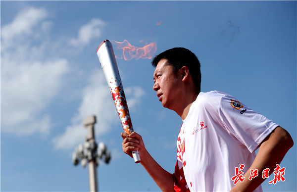 长江日报融媒体8月1日讯(记者李勇发自南昌)8月1日,作为武汉军运会南昌火炬传递的最后一棒火炬手,我国篮球界的标志性人物、八一南昌男篮主教练王治郅手持火炬跑上主席台,点燃圣火盆。