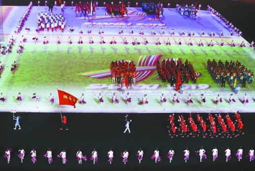 开幕式上,湖南代表团在第18个出场,来自水上皮划艇项目的运动员袁玉卓担当旗手,他带领着举重、乒乓球、网球等项目的49名湘籍健儿迈着矫健的步伐入场。