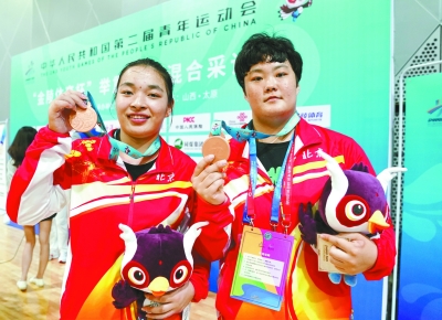 张婷(左)和王悦在赛后展示她们的奖牌。 本报记者 刘平摄