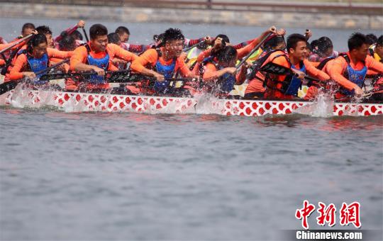 龙舟运动员在赛场上奋力拼搏。 卢键 摄