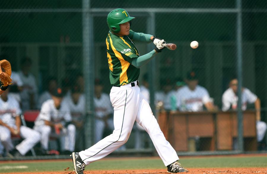 9月22日,天津雄狮队球员高嘉强(中)在比赛中击球。 当日,在2019赛季中国棒球职业联赛(CNBL)第15轮比赛中,北京猛虎队主场以9比7战胜天津雄狮队。 新华社记者李俊东摄