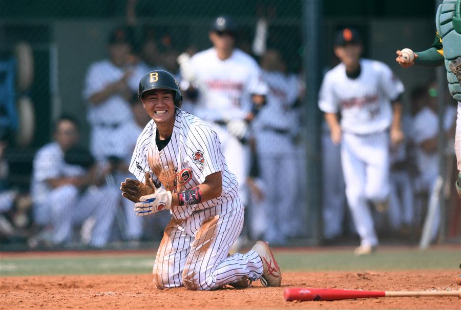 9月22日,北京猛虎队球员陆昀(中)扑本垒得分后庆祝。 当日,在2019赛季中国棒球职业联赛(CNBL)第15轮比赛中,北京猛虎队主场以9比7战胜天津雄狮队。 新华社记者李俊东摄