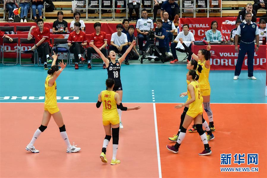 这是2019年9月28日,中国队球员在大阪女排世界杯循环赛中战胜塞尔威亚队并提前锁定冠军后庆祝。 新华社发