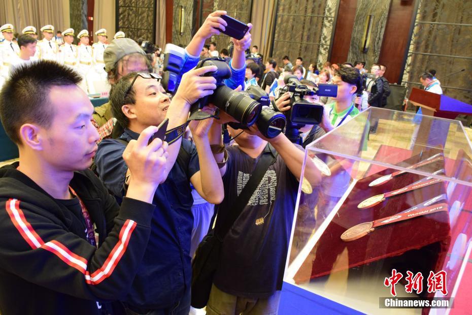 军运会奖牌、奖杯吸引媒体关注。