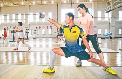 教练后敏芳(右)在指导八一空军五项队队员李睿(左)进行击剑训练。