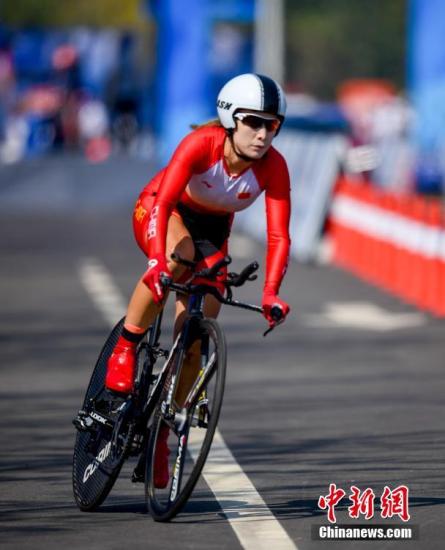 10月19日,第七届世界军运会女子公路自行车个人计时赛上,法国选手Eraud Severine夺得冠军,中国选手梁洪玉获得铜牌。图为中国选手梁洪玉在比赛中。中新社记者 张畅 摄