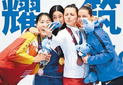 图为10月20日,中国选手钱佳睿(左一)在颁奖仪式上与其他获奖选手合影自拍。