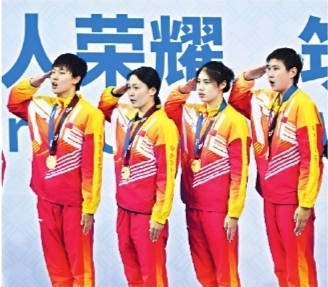 22日晚,军运会中国游泳队夺得女子4x200米自由泳接力比赛金牌 长江日报记者田飞 摄