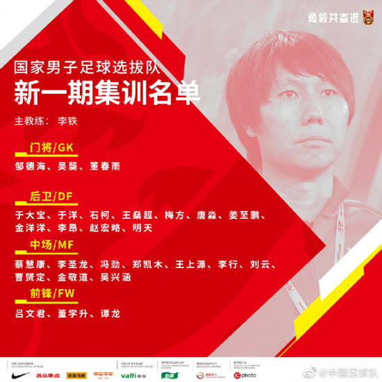 人民网北京10月31日电(马翼) 今日,中国足协官方宣布,李铁将任主教练带领中国国家男子足球队出征东亚杯,并公布了入选球员名单,其中于大宝、姜志鹏、王燊超、曹赟定、吴兴涵、李圣龙、金敬道在列。