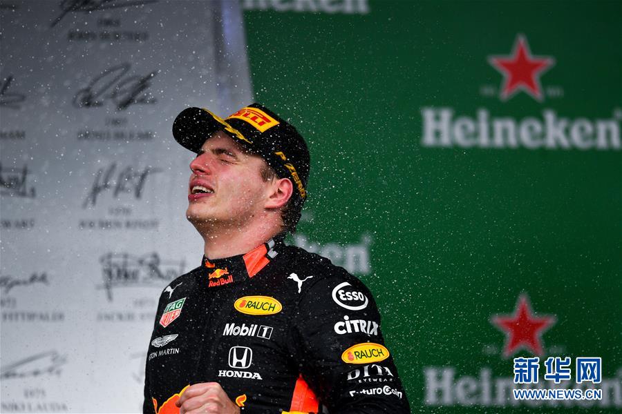 11月17日,红牛车队荷兰车手维斯塔潘在颁奖仪式上。 当日,在巴西圣保罗举行的2019年F1巴西大奖赛正赛中,红牛车队荷兰车手维斯塔潘以1小时33分14秒678的成绩夺得冠军,红牛二队法国车手加斯利获得亚军。在大奖赛结束两小时后,第三个冲过终点的梅赛德斯车队英国车手汉密尔顿因犯规被国际汽联加罚5秒钟,原本排在第四名的迈凯伦车队西班牙车手塞恩斯成为季军。 新华社记者辛悦卫摄