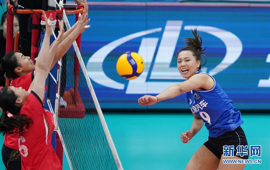 11月19日,北京汽车队球员曾春蕾(右)在比赛中扣球。 当日,在2019-2020赛季中国女子排球超级联赛第一阶段A组第五轮比赛中,北京汽车队主场以3比0战胜福建安溪铁观音队。 新华社记者贾宇辰摄