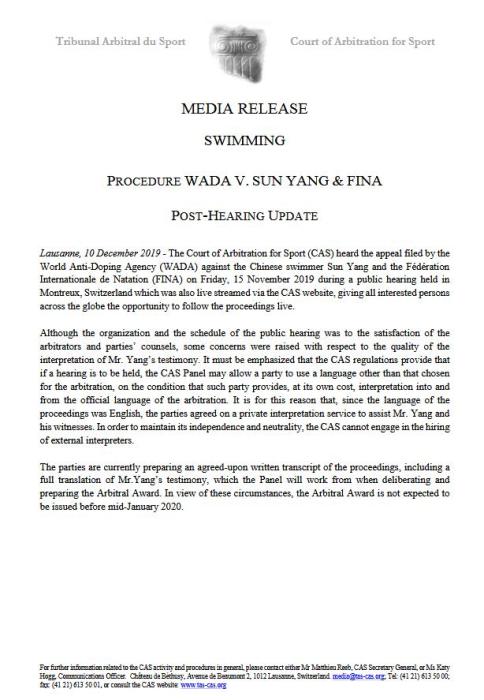 国际体育仲裁法庭发布公告称:“2019年11月15日周五,体育仲裁法庭审理了世界反兴奋剂机构对中国游泳运动员孙杨和国际泳联的上诉。在瑞士蒙特勒举行的听证会,通过网站进行了直播,让所有对此事感兴趣的人有机会关注会议的进程。