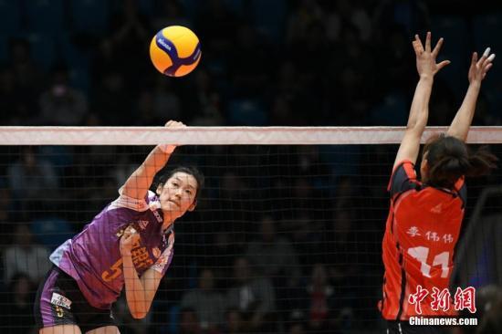 资料图:11月5日,天津渤海银行队球员朱婷(左)在比赛中扣球。当晚,在2019-2020赛季中国女排超级联赛第一阶段B组第二轮比赛中,天津渤海银行队以3:0战胜河南银鸽投资队。中新社记者 佟郁 摄