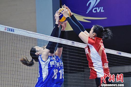 资料图:2018-2019中国女排超级联赛第二阶段展开第四轮较量。图为恒大女排(蓝)拦网。夏晨希 摄
