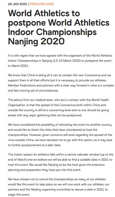 世界田联在一份声明中表示,鉴于目前疫情,出于保护运动员和相关工作人员的安全考虑,经过与赛事组委会协商,决定将本次赛事推迟到明年3月举办。
