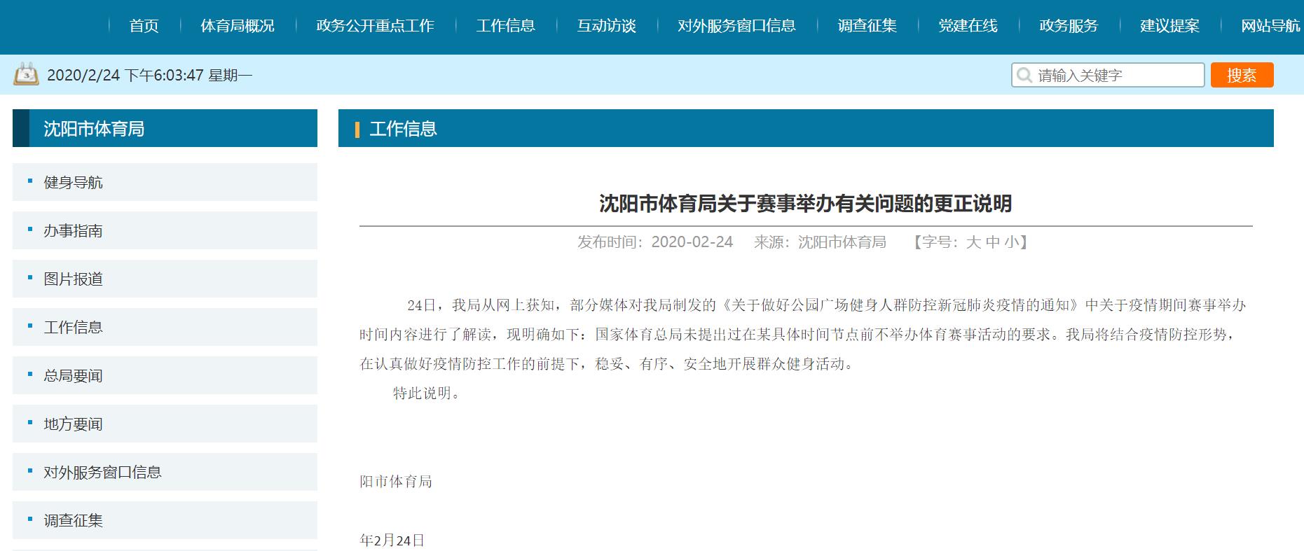 24日下午,沈阳体育局又做出补充说明,在《沈阳市体育局关于赛事举办有关问题的更正说明》中表示:“24日,我局从网上获知,部分媒体对我局制发的《关于做好公园广场健身人群防控新冠肺炎疫情的通知》中关于疫情期间赛事举办时间内容进行了解读,现明确如下:国家体育总局未提出过在某具体时间节点前不举办体育赛事活动的要求。我局将结合疫情防控形势,在认真做好疫情防控工作的前提下,稳妥、有序、安全地开展群众健身活动。”