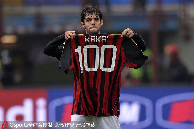 2014年1月,在重返AC米兰后,卡卡为球队打入米兰生涯第100粒进球。图为卡卡展示球衣。