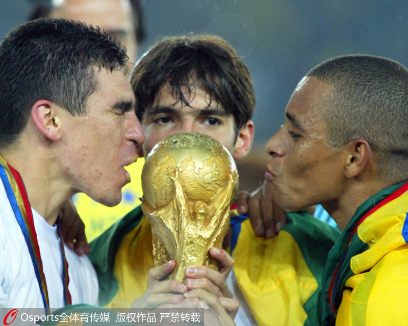 2002年世界杯决赛,巴西2-0德国。卡卡与卢西奥、吉尔伯托共同庆祝夺冠。
