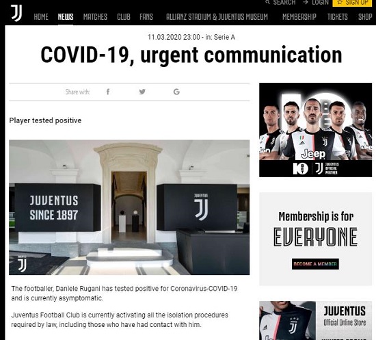 人民网北京3月12日电(管若寒)北京时间今晨,意甲联赛尤文图斯俱乐部在官网发布紧急通知,后卫鲁加尼新冠肺炎病毒检测结果为阳性,目前暂无症状。