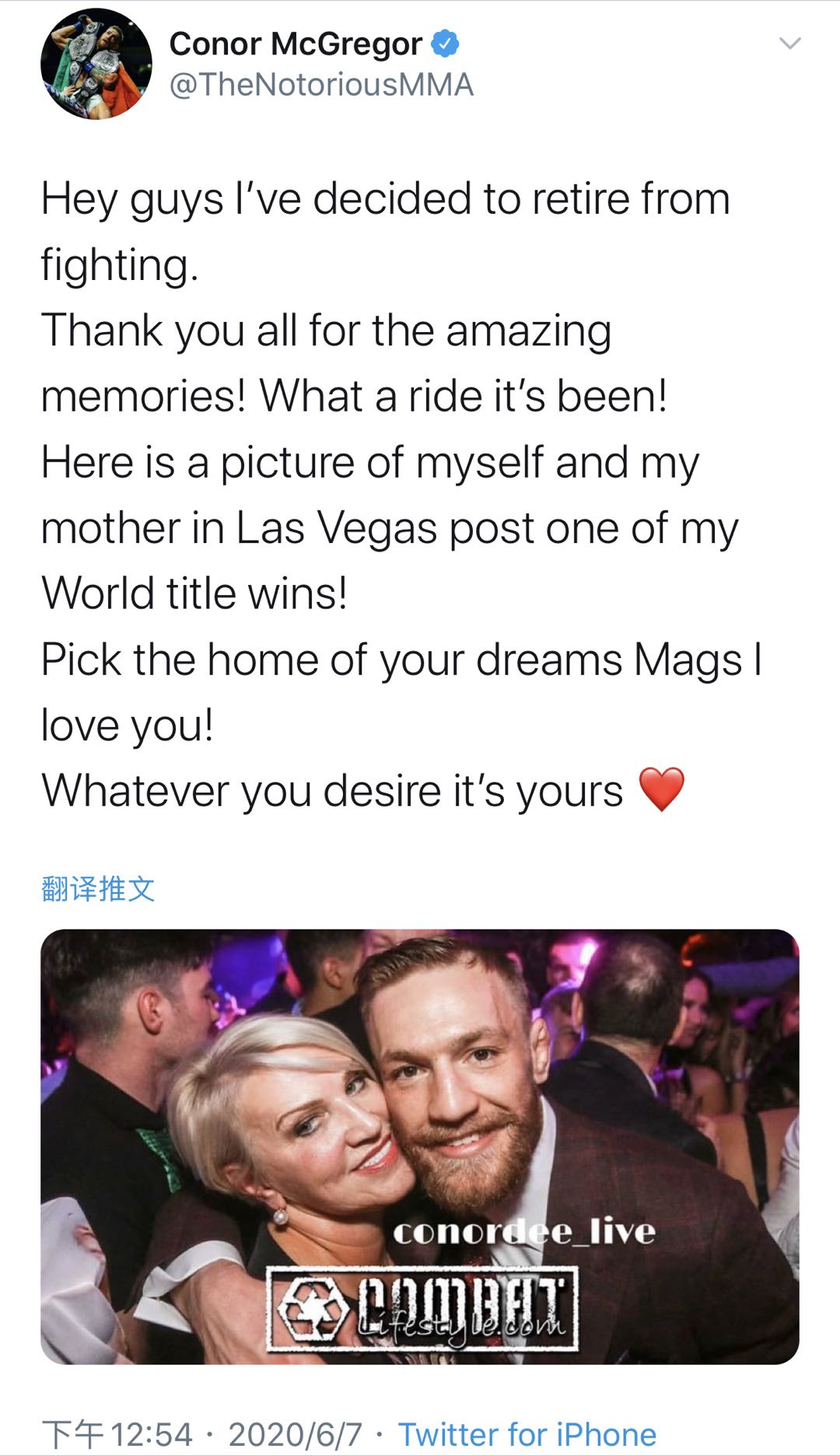 绰号“嘴炮”的前UFC羽量级、轻量级冠军康纳-麦格雷戈7日通过社交媒体发布动态称:“嘿,伙计们,我决定退役了!谢谢你们给我留下了美好的回忆!这是一段多美妙的经历啊!这是一张我和我妈在拉斯维加斯的照片,是我夺得其中一个世界冠军的夜晚!世界有多大,梦想就有多大。”