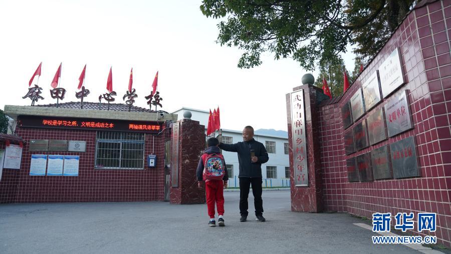 在江西省萍乡市武功山风景名胜区麻田中心学校,朱志辉在校门口迎接来上学的学生(11月11日摄)。