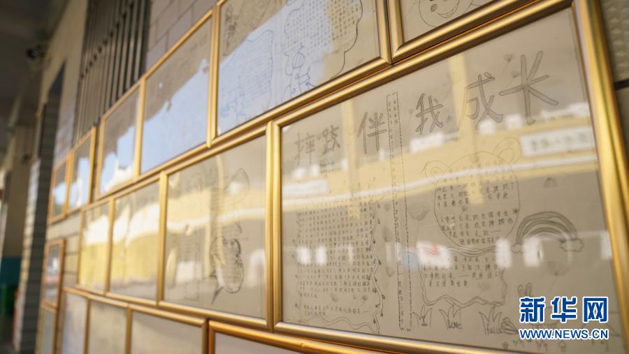 在江西省萍乡市武功山风景名胜区麻田中心学校摔跤馆,学生创作的关于摔跤运动的手绘海报挂在走廊墙上(11月10日摄)。