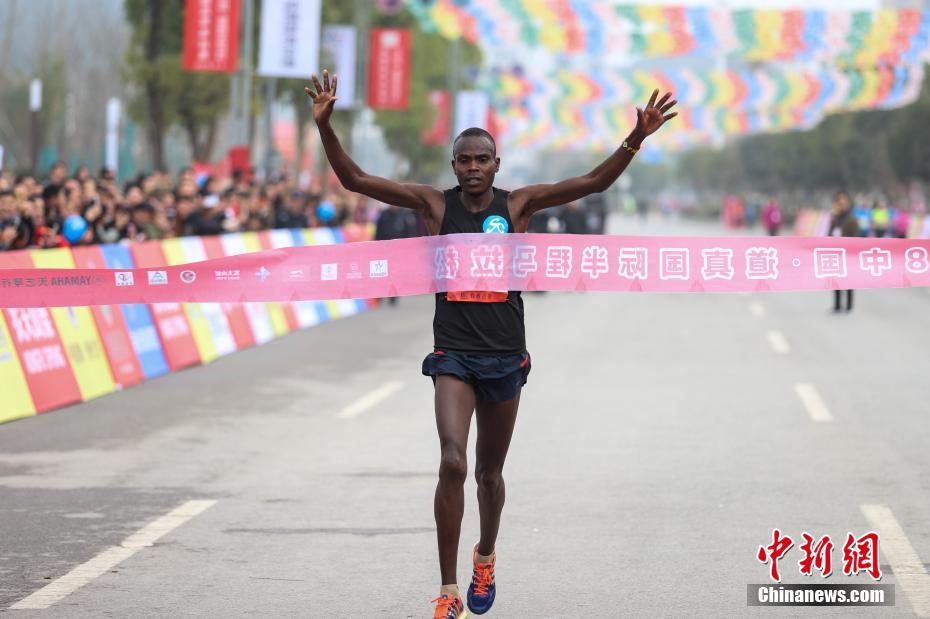 3月4日,肯尼亚选手获得男子半程第一名。当日,2018中国·道真国际半程马拉松赛在贵州省道真自治县举行。本次赛事共有5000名运动员参加,其中,有来自俄罗斯、意大利、乌克兰、肯尼亚等国家以及中国选手1000人参加男女半程马拉松,贵州省内及本地选手2000人参加10公里欢乐跑,情侣及亲子组2000人参加3公里比赛。中新社记者 瞿宏伦 摄