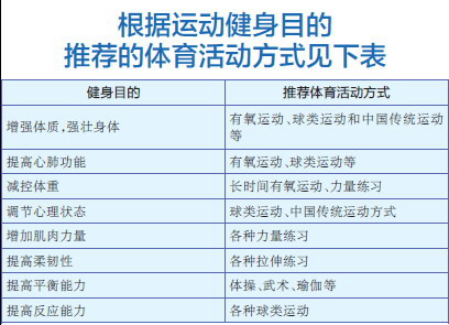 以增强体质、强壮身体为主要目的的体育锻炼者,可选择自己喜欢的、可以长期坚持的活动方式,如有氧运动、球类运动和中国传统健身运动等。