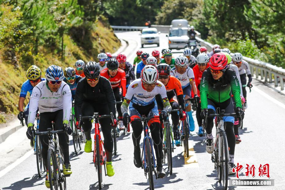 10月16日,“2018首届跨喜马拉雅自行车极限赛”在西藏林芝鸣枪开赛,此项赛事赛程为3天,共有来自中国25个省(区、直辖市)约400名男女车手参赛。图为首日林芝到工布江达的赛段竞争非常激烈,多位车手冲在最前形成庞大的第一集团。中新社记者 苏鸿滨 摄