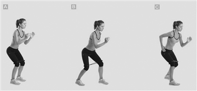 训练要求:将弹力环套在膝盖髌骨上方,双脚开立略比肩宽,屈髋屈膝半蹲位,膝脚同向朝前,两臂屈肘置于体侧;向前迈步,两脚交替过程中始终保持弹力环紧绷;前进约15-20米,2-4组;