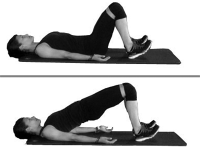 训练要求:弹力环置于膝盖上方,仰卧位,双脚分开略比肩宽并勾脚;臀肌发力向上顶起,大腿躯干一条线为宜。重复10-15次,2-4组;