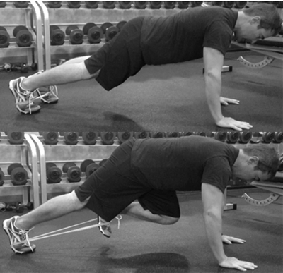 训练要求:弹力环套在脚前掌,俯卧位,两脚开立前脚掌支撑,双臂伸展支撑;右腿伸直固定弹力环一端,左腿勾脚抬腿向腹部靠拢,单侧重复8-12次即可,2-4组。