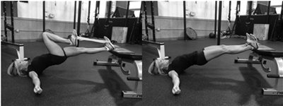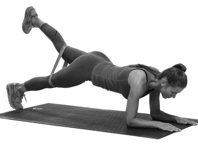 训练要求:屈肘90°俯撑姿势,保持躯干平直;弹力环套在膝关节处,单脚支撑固定一侧,另一侧直腿上抬,单侧重复8-12次即可,2-4组。